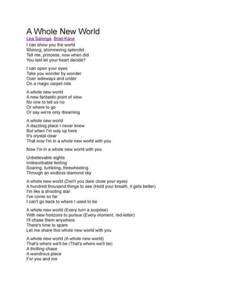 Get lyrics of A whole new world lea song you love. List contains A whole new world lea song lyrics of older one songs and hot new releases. Get known every word of your favorite song or start your own karaoke party tonight :-).