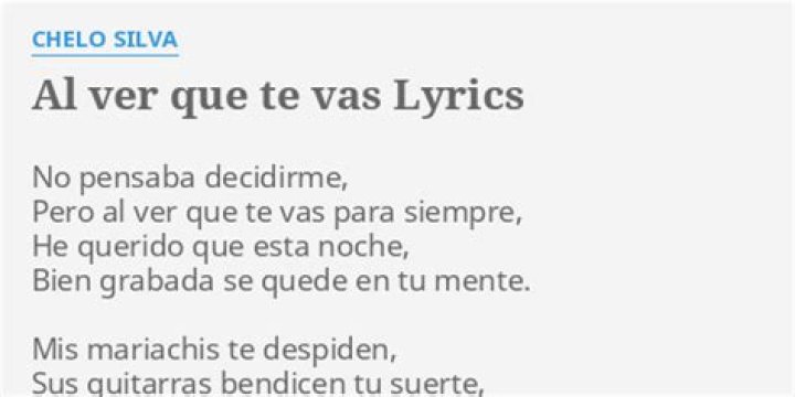 Jesus Chuy Garcia submitted the lyrics for this song. Please review the lyrics to make it available for everyone. Review Lyrics. Musixmatch logo. English. English ...Chelo - Al Ver Que Te Vas Lyrics