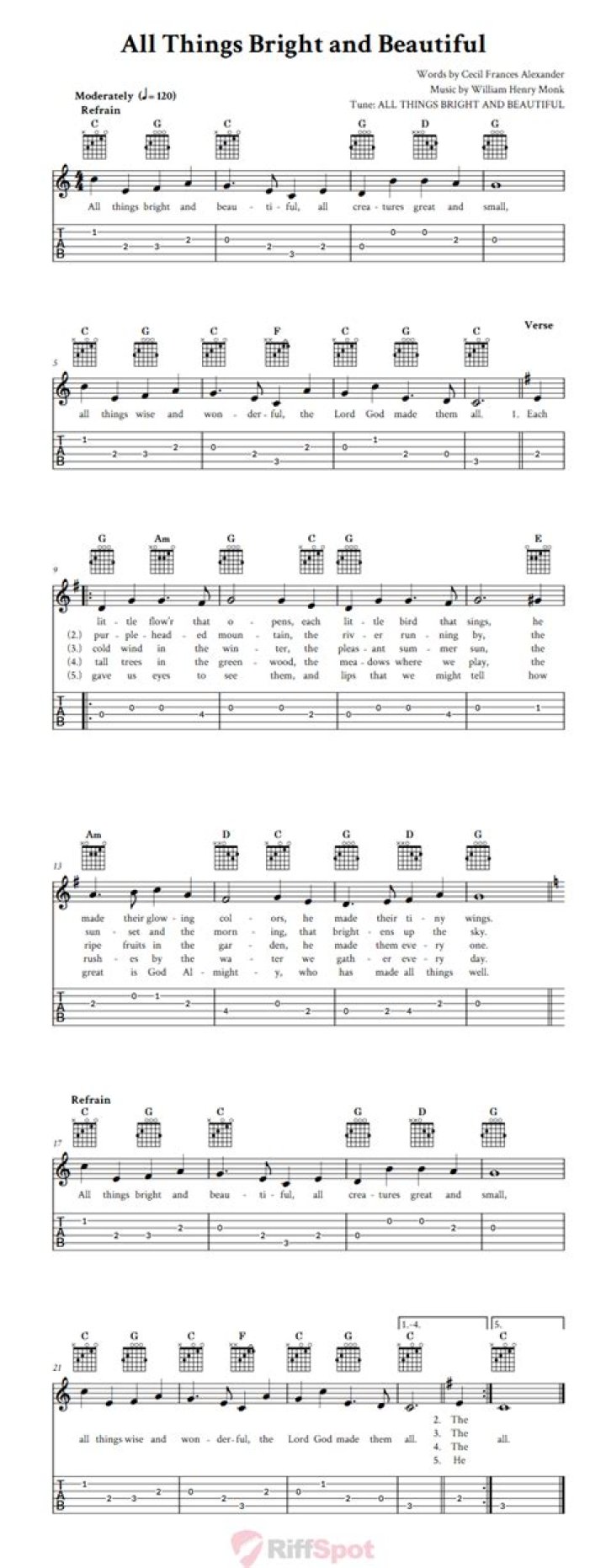 Turn to the right, it's more attractiveWear suit and tie, loosen your gripSay what you like but do not say thatTake me to bed but do not do thatGive me some space, love and affectionPlease hold my hand when we cross the streetWrite me a song, sing it nice and sweetI ...All Things Bright and Beautiful Lyrics - Religious Music