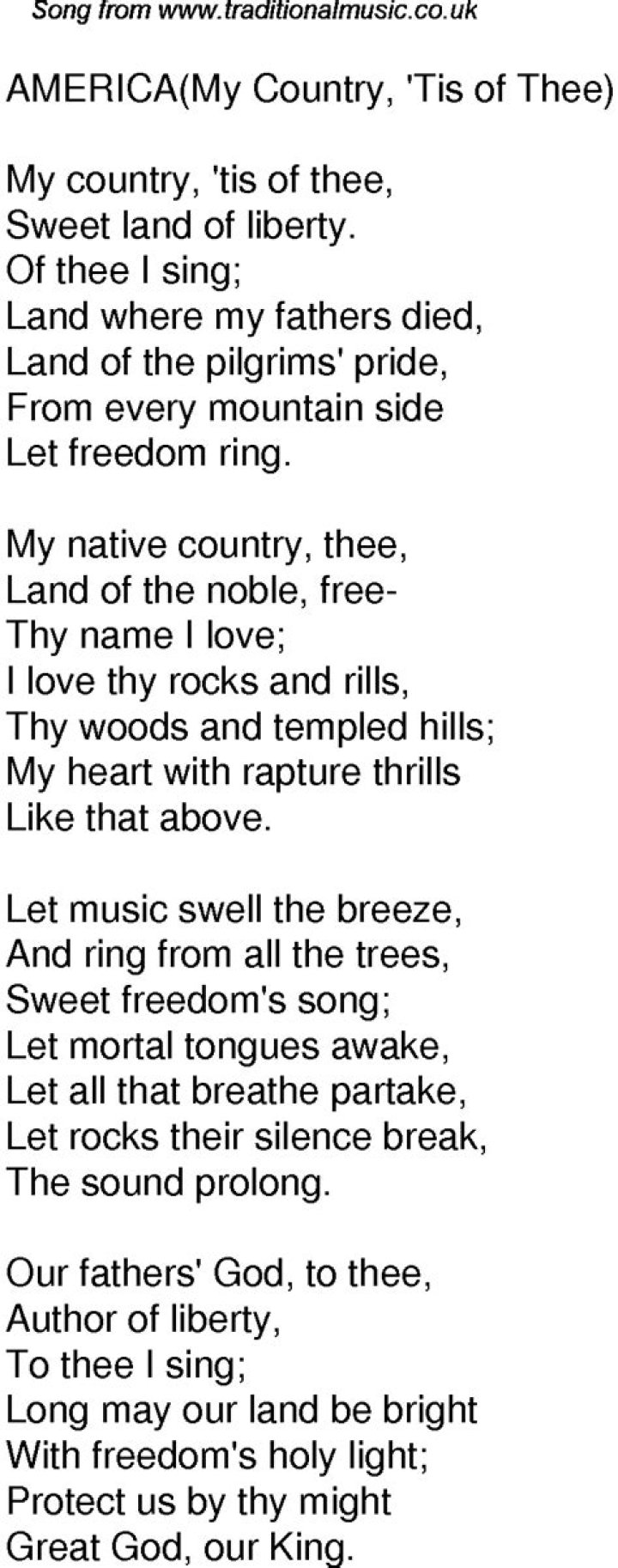 Lyrics to 'America' by Children. My country 'tis of thee, / Sweet land of liberty, / Of thee I sing. / Land where my fathers died! / Land of the Pilgrim's.