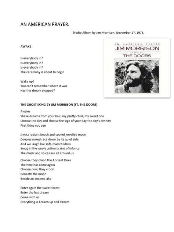 Beside an ancient lake. Enter again the sweet forest. Enter the hot dream ... for these lyrics. A-Z Lyrics · D · THE DOORS Lyrics. "An American Prayer" (1978).THE DOORS - AN AMERICAN PRAYER LYRICS