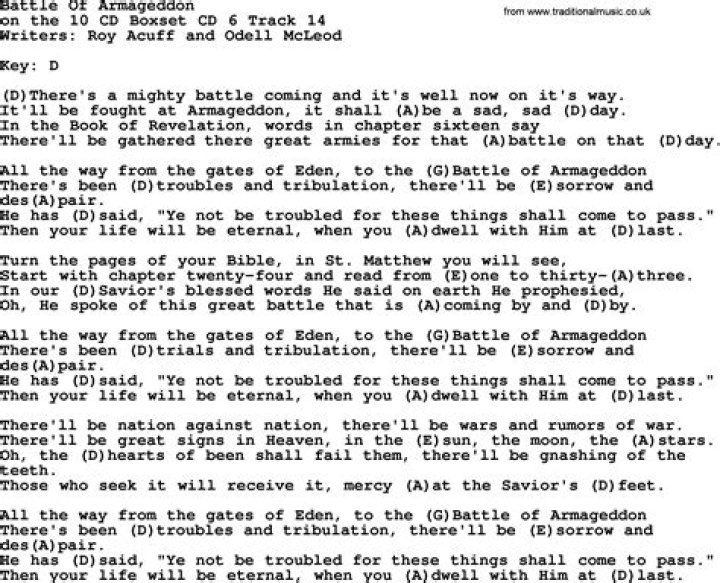 Jun 28, 2010 Lyrics for The Battle of Armageddon by Tyrant. I saw the beast and the kings of the earth And their armies gathered together to fight the god they ...