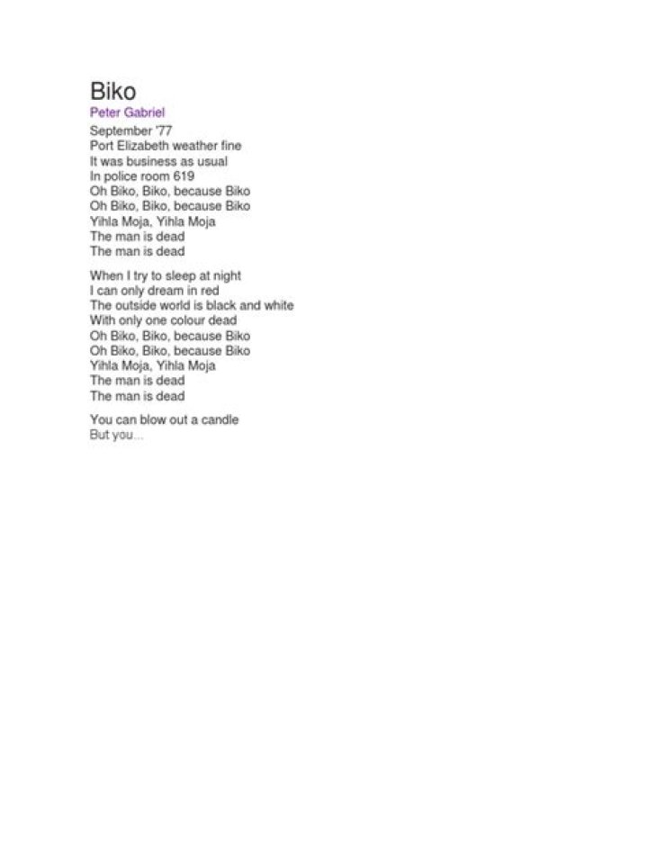 Oh Biko, Biko, because Biko Oh Biko, Biko, because Biko Yihla Moja, Yihla Moja-The man is dead When I try to sleep at night I can only dream in red The outside world is black and white With only one colour dead Oh Biko, Biko, because Biko Oh Biko, Biko, because Biko Yihla Moja, Yihla Moja-The man is dead You can blow out a candle But you can't ...