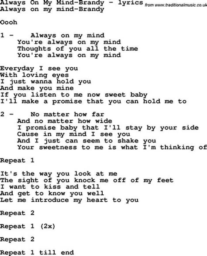 [1] - Always on my mind You're always on my mind Thoughts of you all the time You're always on my mind Everyday I see you With loving eyes I just wanna hold you And make you mine If you listen to me now sweet baby I'll make a promise that you can hold me to [2] - No matter how far And no matter how wide I promise baby that I'll stay by your sideBRANDY - ALWAYS ON MY MIND LYRICS