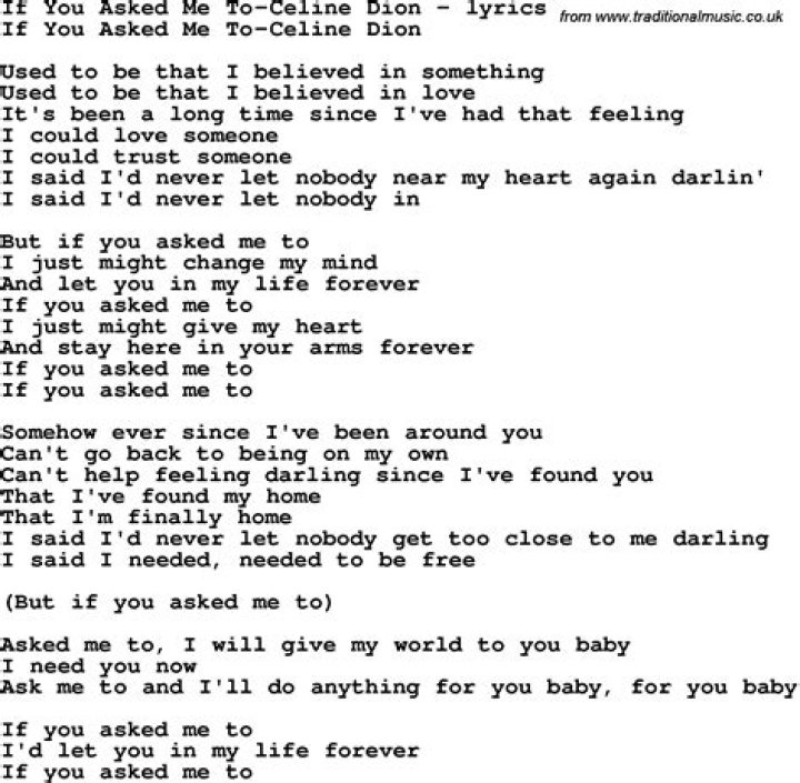 If you asked me to I just might give my heart And stay here in your arms forever If you asked me to If you asked me to Asked me to, I will give my world to you baby I need you now Ask me to and I'll do anything for you baby, for you baby If you asked me to I'd let you in my life forever If you asked me to Submit lyrics correction → 55k LikeC�LINE DION - IF YOU ASKED ME TO LYRICS