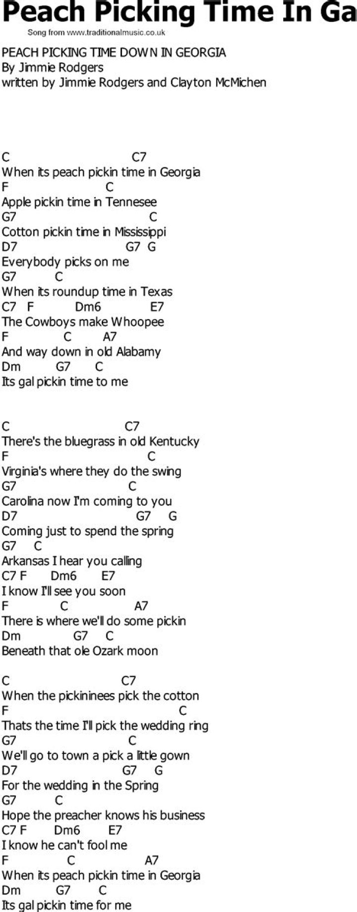 Send me a peach from old Georgia Down where the Savannah flows If I could have one bite of Georgia I would feel right here at home I miss the shady old lanes there Walking with you by my side Just send me one peach from Georgia Just so I know you'll be mine I hope that you won't forget me Before my road leads back to you Though the winter may bringCOUNTRY MUSIC LYRICS