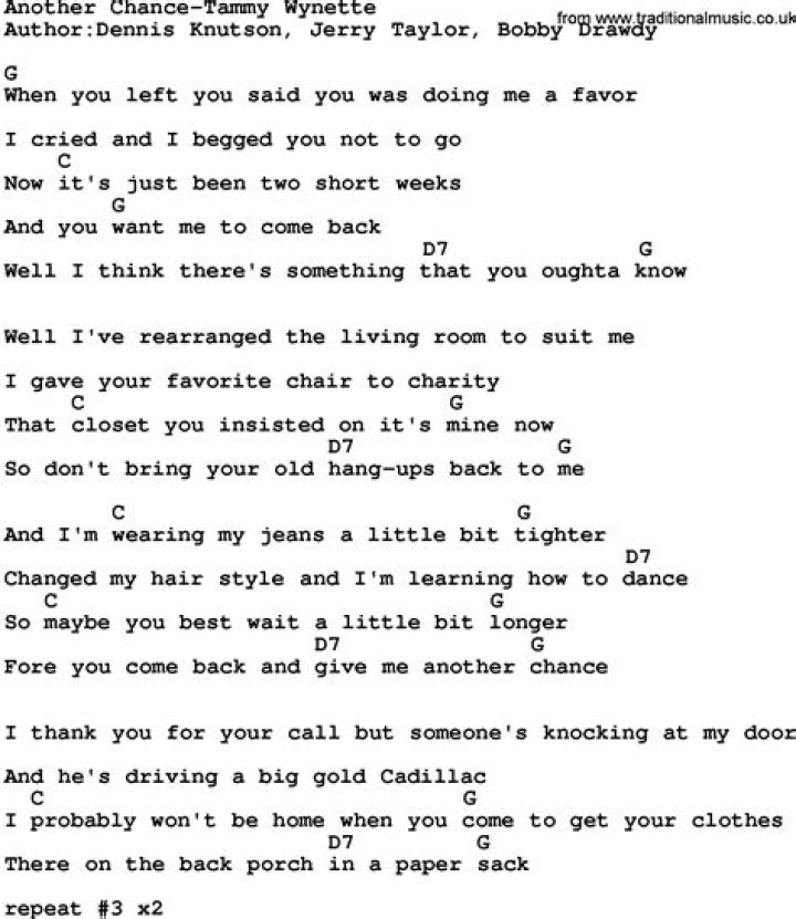 Jeff Bates - One Second Chance Lyrics. It says here your from Houston Certified to drive a truck It didn't say what ou've been doing The last five years Then I ...TAMMY WYNETTE - ANOTHER CHANCE LYRICS