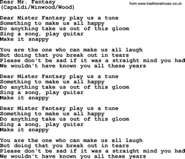 Lyrics to "Dear Mr. Fantasy" song by TRAFFIC: Dear Mister Fantasy play us a tune Something to make us all happy Do anything take us out of this gl...