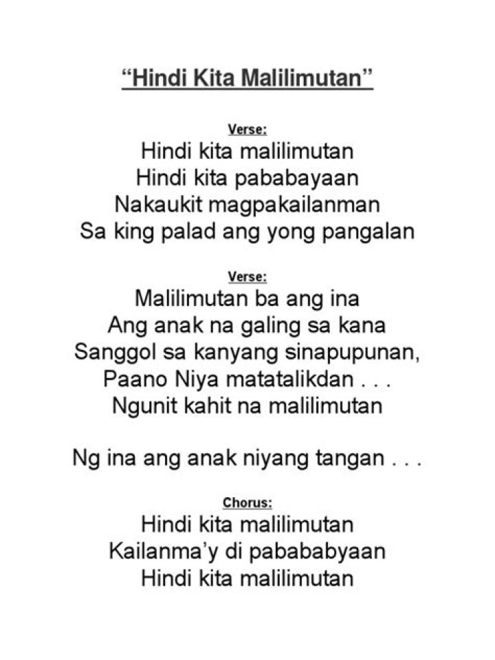 Kailanma'y di pababayaan. Hindi kita malilimutan. Kailanma'y di pababayaan. Malilimutan ba ng ina. Ang anak na galing sa kanya. Sanggol sa kanyang sinapupunan. Paano niyang matatalikdan. Ngunit kahit na malimutan. Ng ina ang anak niyang tangan.BASIL VALDEZ - HINDI KITA MALILIMUTAN LYRICS