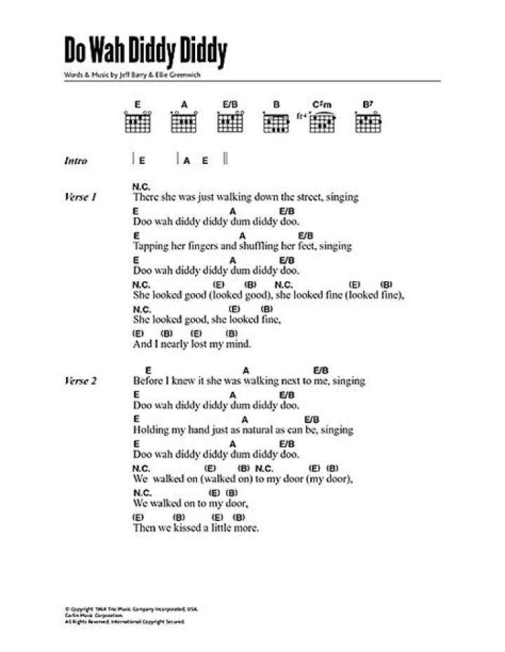 There he was just a walking down the street Singin' Do Wah Diddy Diddy down diddy to Snapping' his fingers and shufflin' his feet Singin' Do Wah Diddy Diddy ...Do Wah Diddy Diddy