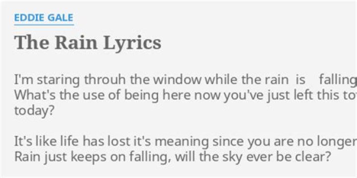 Oops, looks like we're missing these lyrics. Help us out by adding them. Submit lyrics. Song Discussions is protected by U.S. Patent 9401941. Other patents ...Eddie Gale - The Rain Lyrics