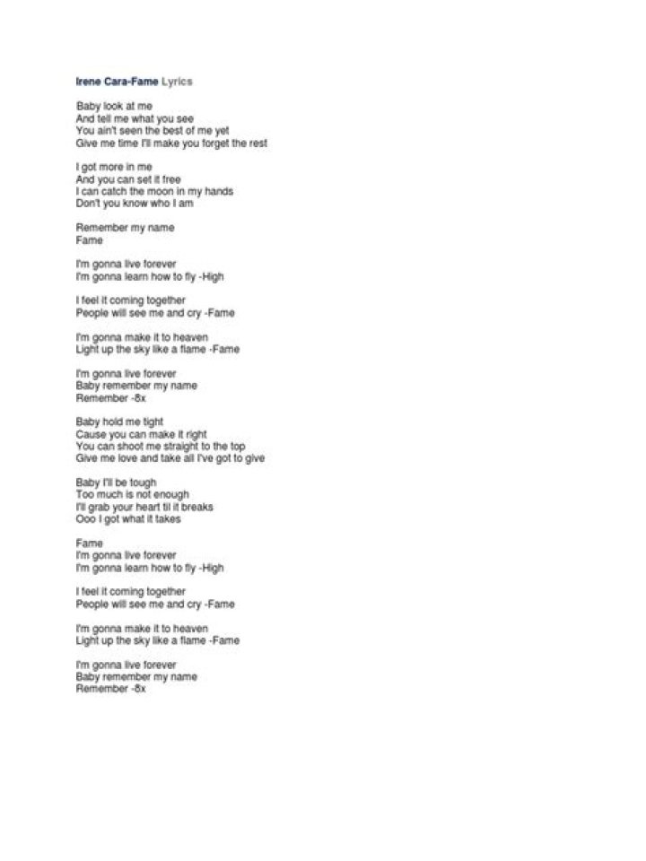(Fame) I'm gonna live forever I'm gonna learn how to fly (High) I feel it coming together People will see me and cry (Fame) I'm gonna make it to heaven Light up the sky like a flame (Fame) I'm gonna live forever Baby, remember my name (Remember, remember, remember, remember) (Remember, remember, remember, remember)Irene Cara - Fame (From "Fame") Lyrics