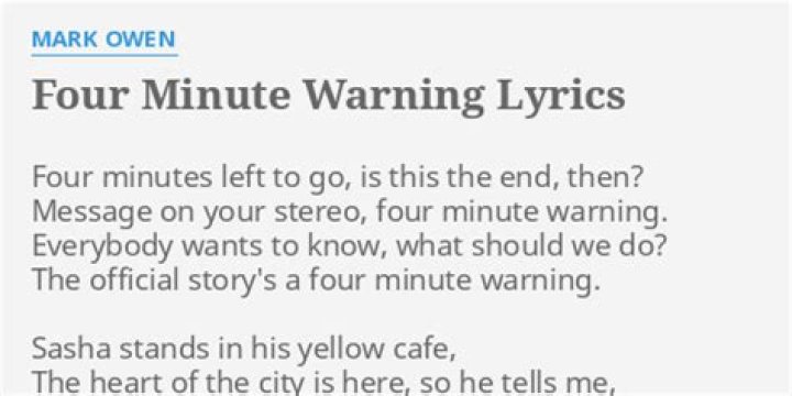 Mark Owen - Four Minute Warning Lyrics. Four minutes left to go, is this the end? That message on your stereo, four minute warning Everybody wants to know ...K-RINO - FOUR MINUTE WARNING LYRICS