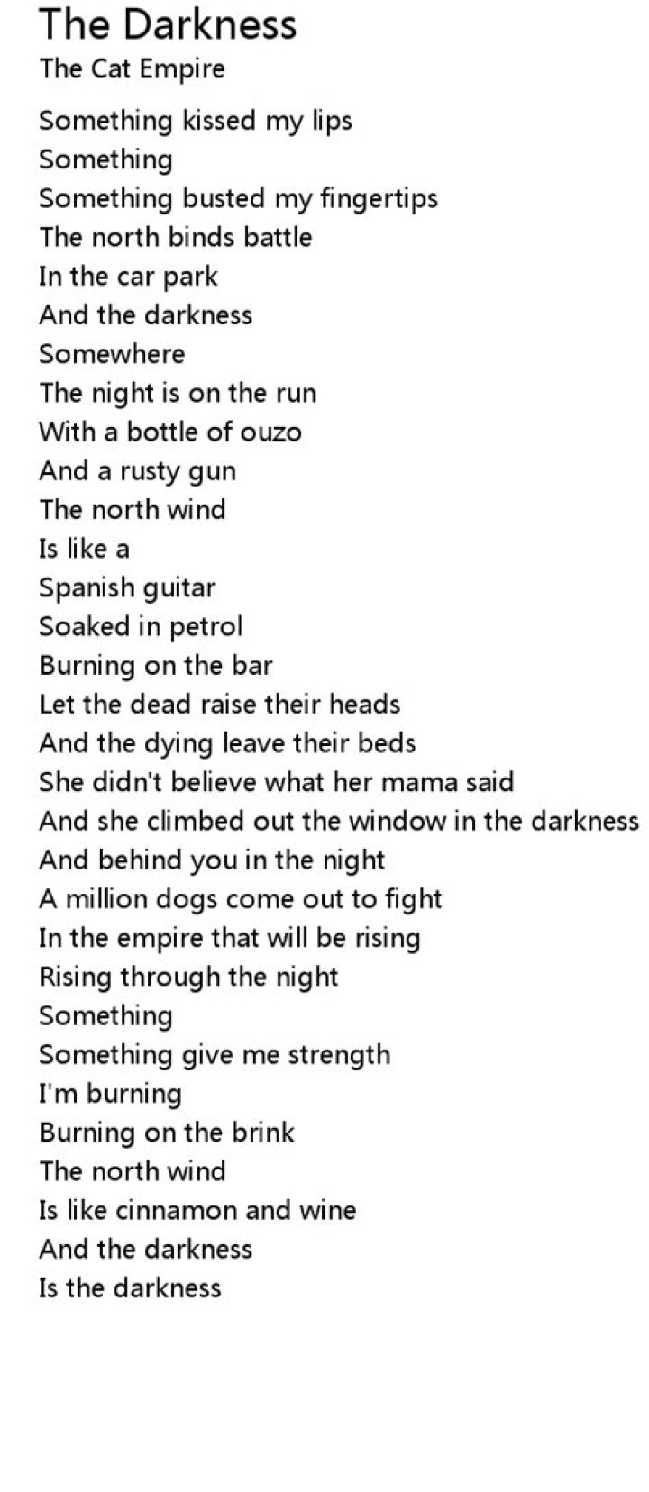 Matthew And The Atlas Lyrics. "Out Of The Darkness". I saw you in my mind when I was younger. And I grew older, and I saw you still. You'd stay close to me sometimes behind my shoulder. When I was weary, trouble would come. In my last defense you tried to warn me. I did not know you, you were a demon to me.Gary Valenciano - Take Me Out Of The Dark Lyrics