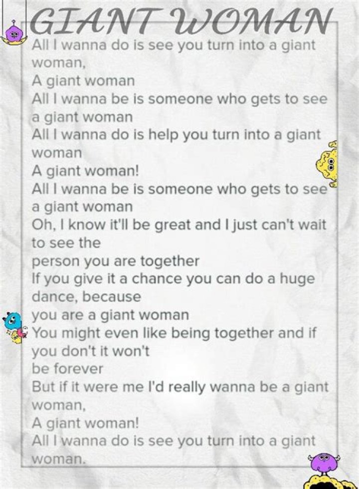 Lyrics to "Giant Woman" song by REBECCA SUGAR: All I wanna do is see you turn into a giant woman, a giant woman! All I wanna be is someone who gets...GIANT WOMAN LYRICS