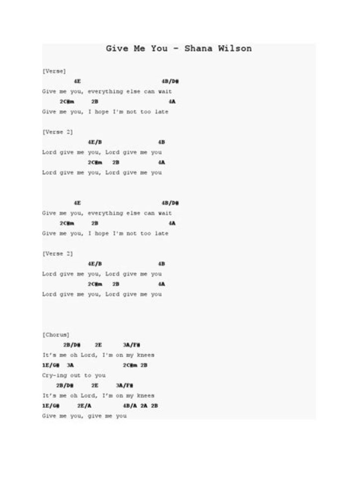 Lyrics to "Give Me You" song by Shana Wilson-Williams: (Lord, give me you...) Give me you Everything else can wait Just give me you I hope I'm not too lat... Shana Wilson-Williams - Give Me You Lyrics | AZLyrics.comShana Wilson - Give Me You Lyrics