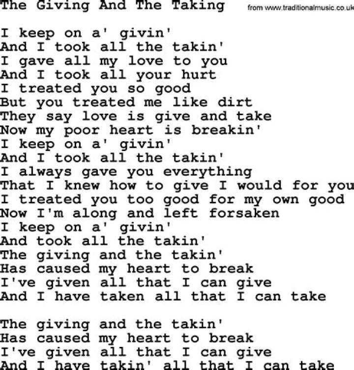 Get lyrics of Giving inside in take song you love. List contains Giving inside in take song lyrics of older one songs and hot new releases. Get known every word of your favorite song or start your own karaoke party tonight :-).
