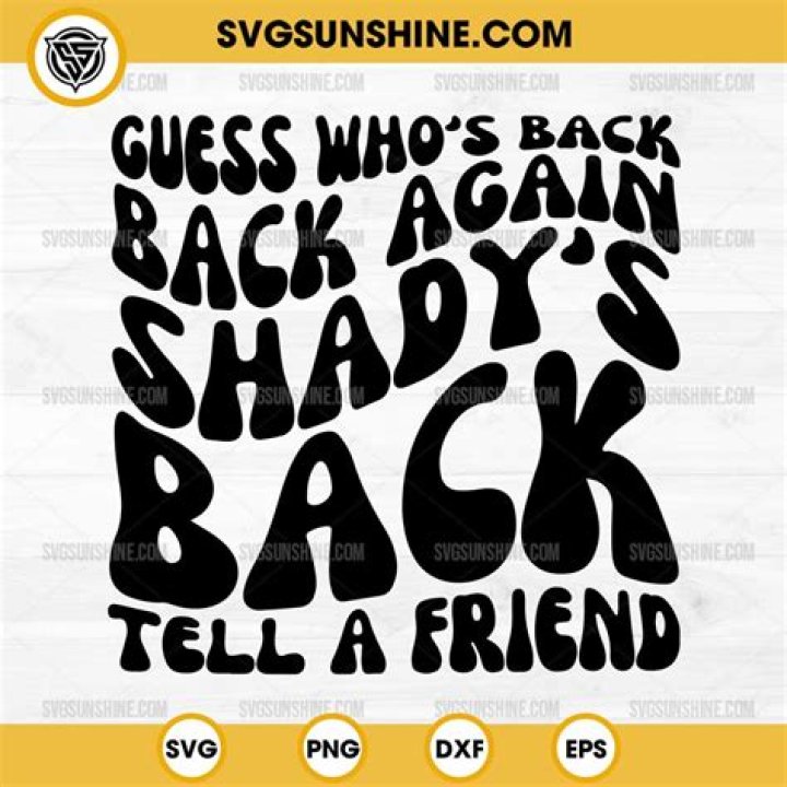 Back again Shady's back Tell a friend Guess who's back, guess who's back Guess who's back, guess who's back Guess who's back, guess who's back Guess who's back. Related. Songs You Love If You Love Nerds; HOT SONG: 21 Savage x Metro Boomin - "My Dawg " - LYRICS;THE BOSSHOSS - WITHOUT ME LYRICS