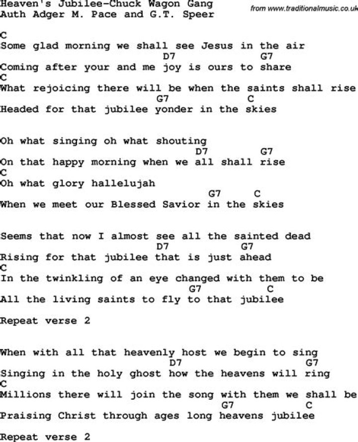 Lyrics for Heaven's Jubilee by Chuck Wagon Gang. Lyrics for Heaven's Jubilee by Chuck Wagon Gang. Type song title, artist or lyrics. Top lyrics Community Apps. Sign ...LEGACY FIVE - HEAVEN'S JUBILEE LYRICS