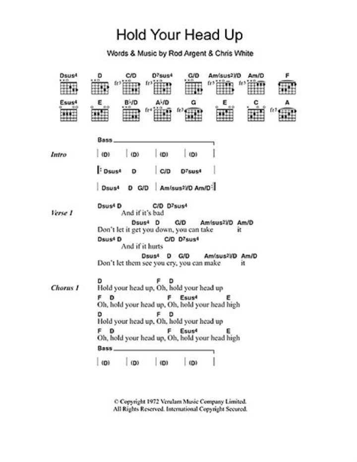 Hold your head up high Even through your darkest night Everything that you do I will be here for you Keep on moving on Even when the day is long Know that you're not alone When this world brings you low You gotta hold it, high, high You know you gotta hold it, high, high Don't find your precious time Is stolen by the thief in the back of your mindHold Your Head Up lyrics by Argent, 1 meaning, official ...
