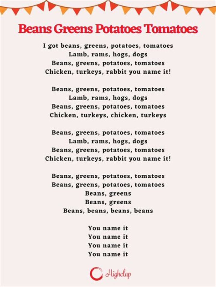 Get lyrics of I got beans, greens, tomatoes,potatoes song you love. List contains I got beans, greens, tomatoes,potatoes song lyrics of older one songs and hot new releases. Get known every word of your favorite song or start your own karaoke party tonight :-).