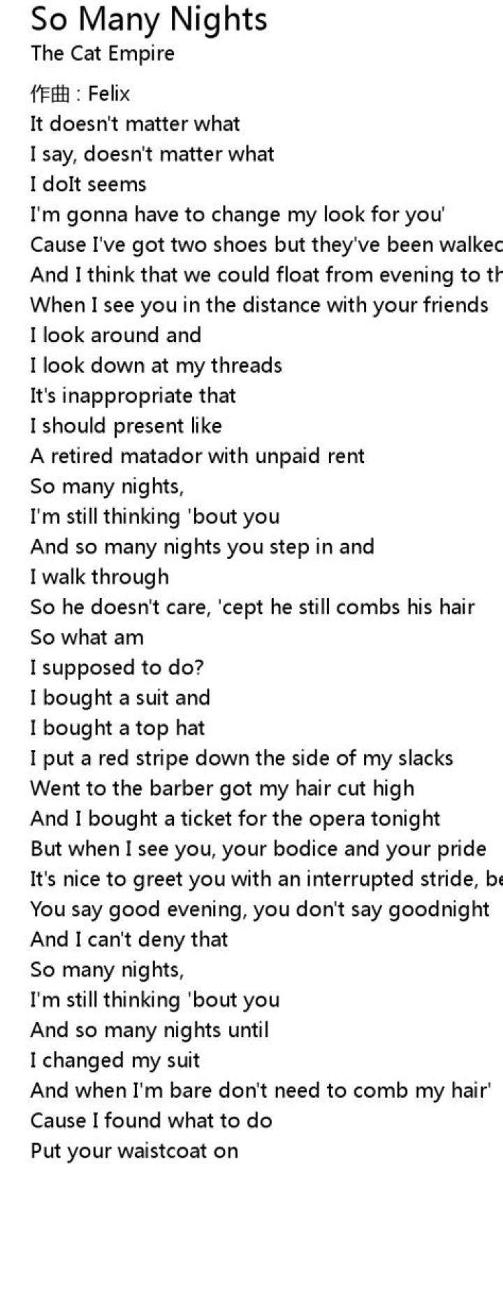 I may have spent too many nights alone. I never let nobody any closer than my body And I never needed someone till now And you know I want so much to reach out my soul and touch you But I don't know if I know how. 'Cause midnight flights and barroom lights And rollin' for three days and nights And open roads have been my only homeThe Cat Empire - So Many Nights Lyrics