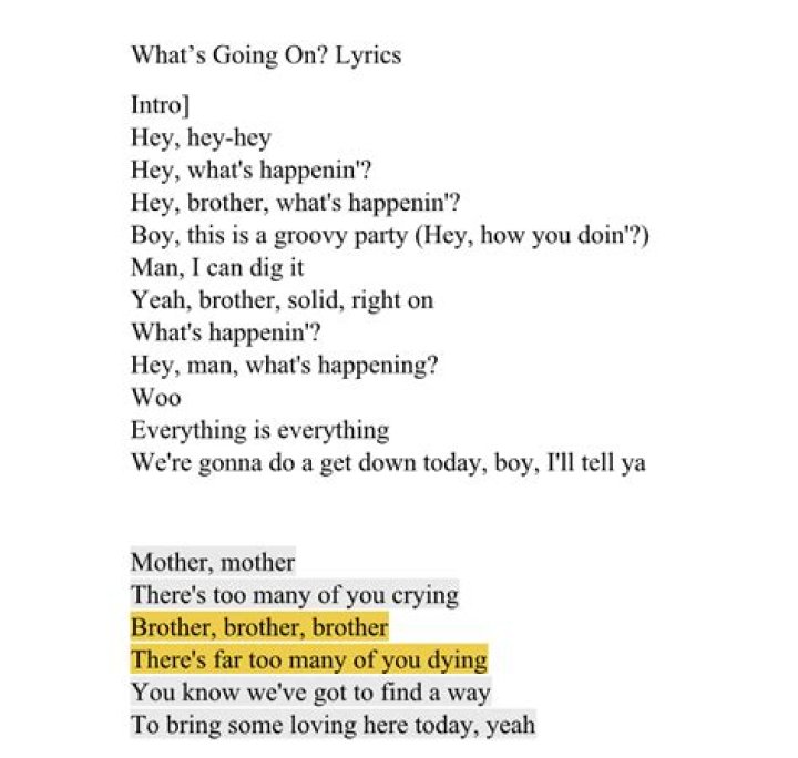 Ah, what's going on. In the mean time Right on, baby Right on Right on. Father, father, everybody thinks we're wrong Oh, but who are they to judge us Simply because our hair is long Oh, you know we've got to find a way To bring some understanding here today Oh. Photos. Picket lines and picket signsWiz Khalifa - Hey Girl Lyrics