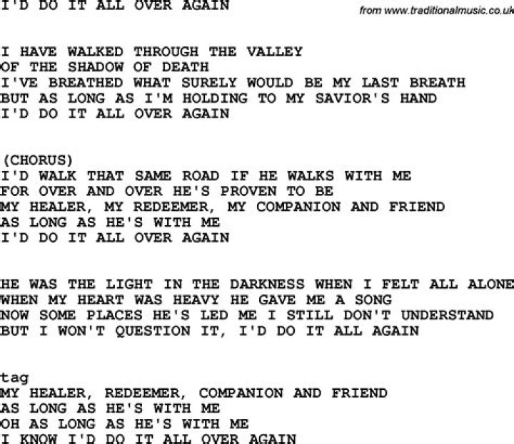 Get lyrics of Id do it all over again song you love. List contains Id do it all over again song lyrics of older one songs and hot new releases. Get known every word of your favorite song or start your own karaoke party tonight :-).
