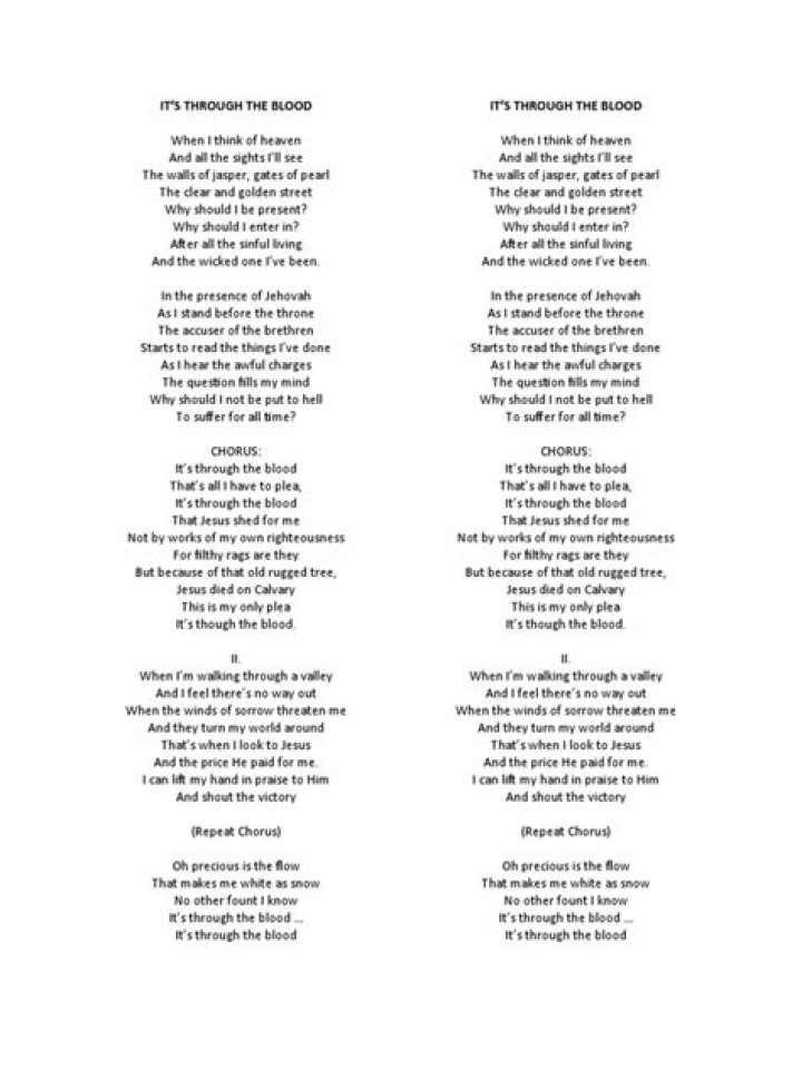 It's through the blood That's all I have to plea It's through the blood That Jesus shed for me Not by works of my own righteousness For filthy rags are they But because of that old rugged tree Hanging on dark Calvary That is my only plea It's through the blood When I'm walking through a valley And I feel there's no way out The wind of sorrow ...Lyrics Through the Blood - musixmatch.com