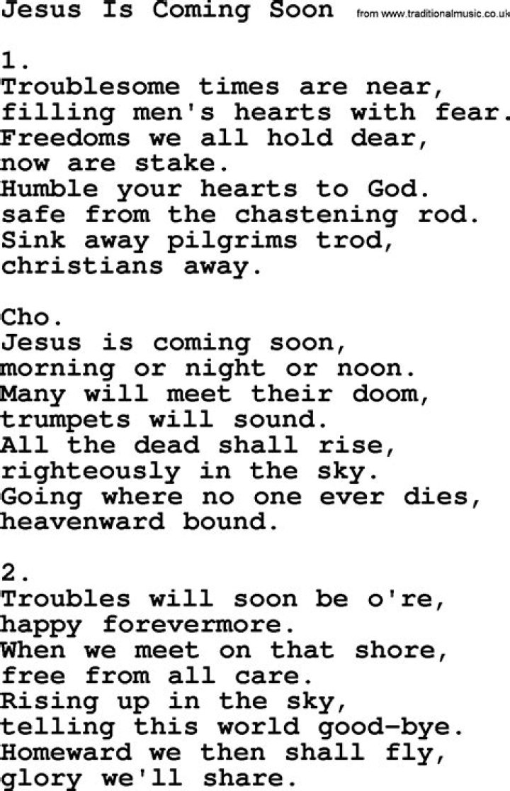 Mar 31, 2016 Lyrics for Coming Soon by The Spencers. Coming soon, Jesus and all his glory Not just a savior, but a reigning king Coming soon an...Jesus Is Coming Soon Lyrics - Kry