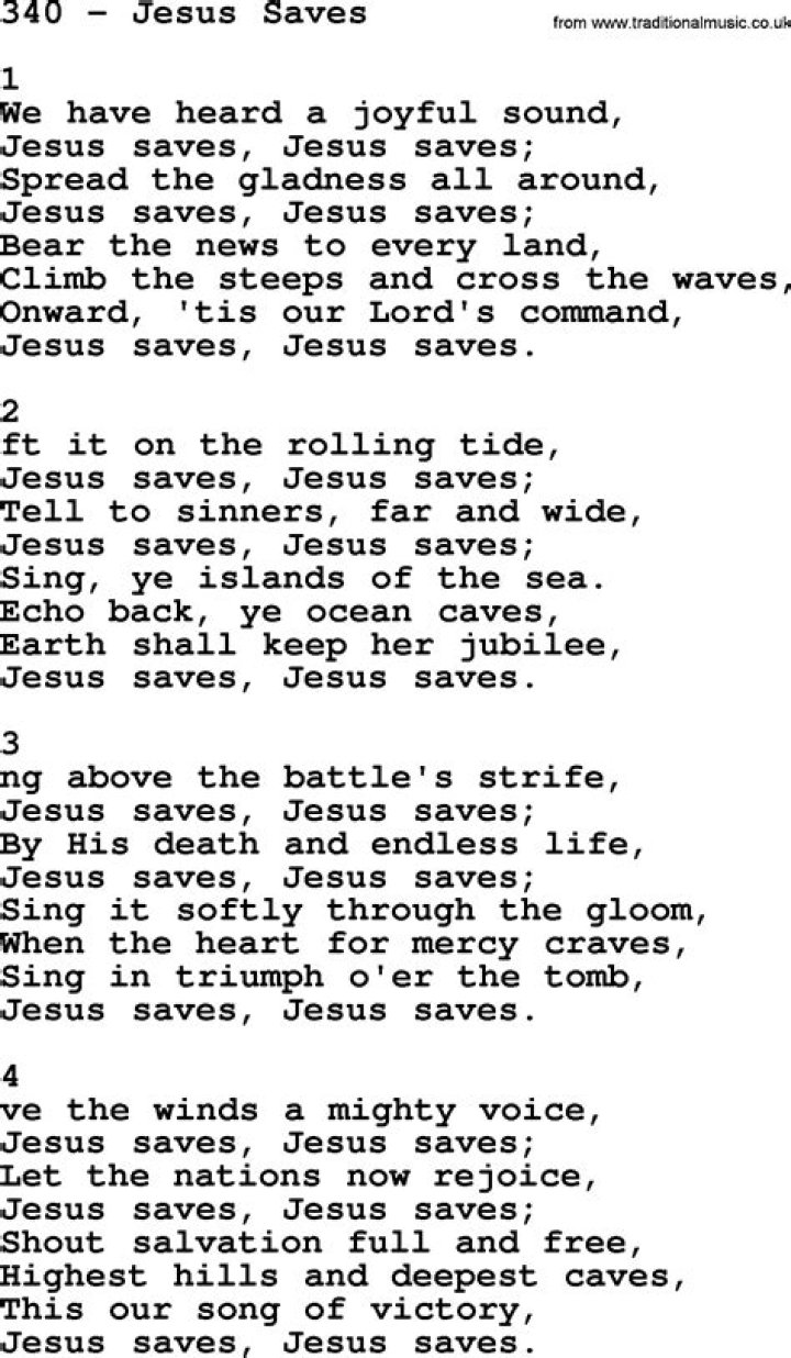 I heard joyful sound, Jesus saves, Jesus saves. Spread the tiding, spread them all around, Jesus saves, Jesus saves. To the utmost Jesus saves. To the utmost Jesus saves. He will pick you up and turn you around, Hallelujah, hallelujah, Jesus saves. Hallelujah, hallelujah, Jesus saves. Now if you′re a liar or a cheater, Don't leave, Jesus ...TIM HUGHES - JESUS SAVES LYRICS