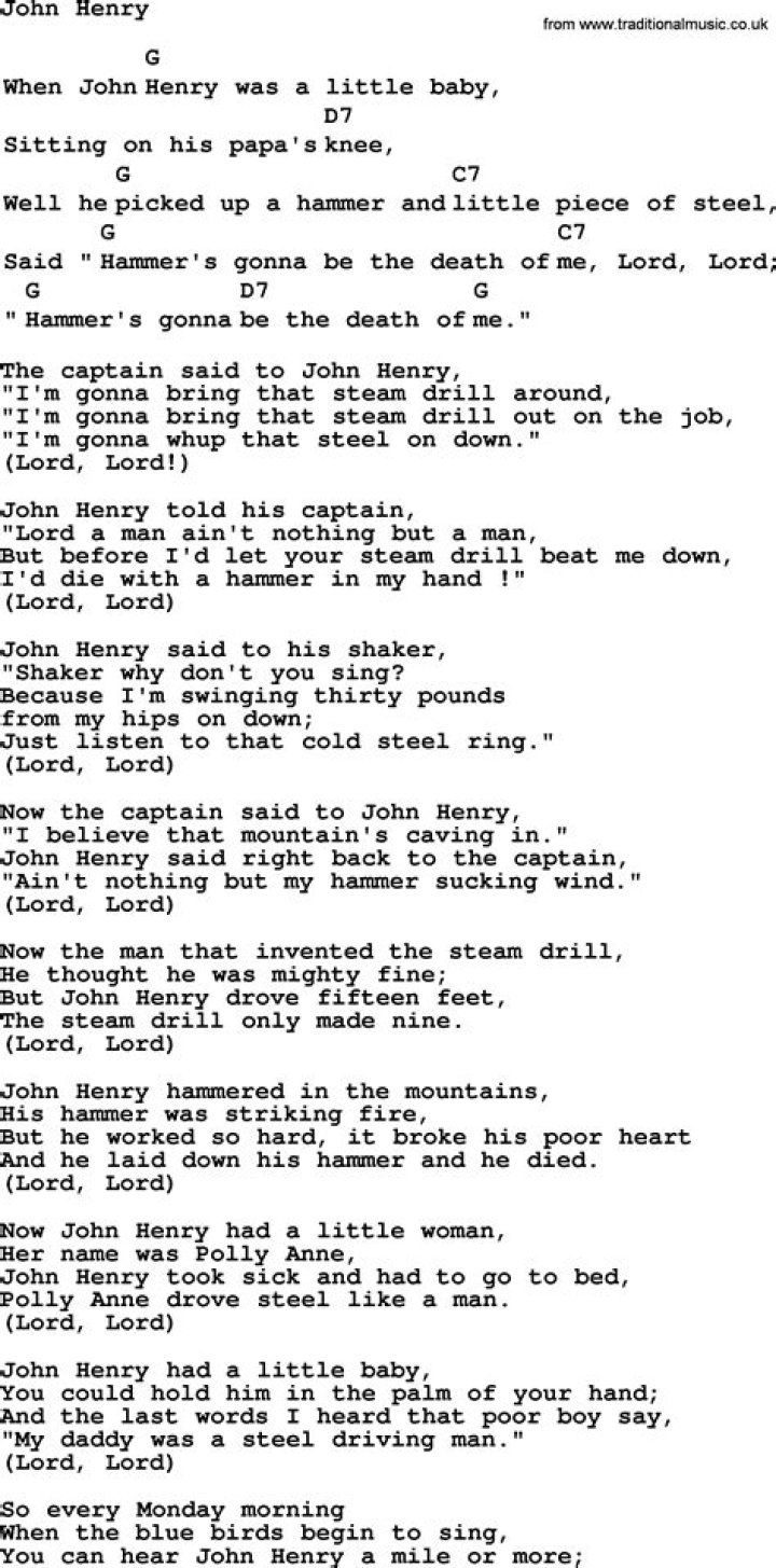 John Henry could've told 'em what that means When the company brought in all the big machines, hey John Henry was a steel drivin' man John Henry was a steel drivin' man He died in West Virginia With his hammer in his hand They sing about him all across the land John Henry was a steel drivin' manJohnny Cash - The Legend Of John Henry's Hammer Lyrics ...