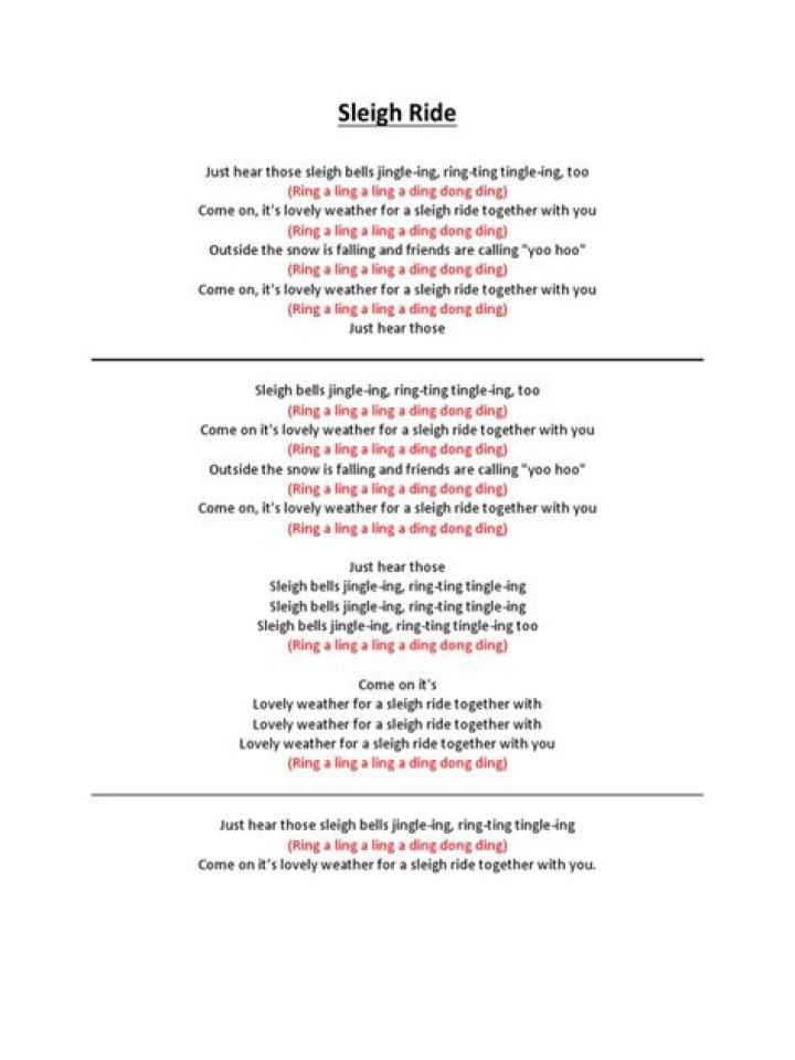 "Sleigh Ride" Just hear those sleigh bells jingling Ring-ting-tingling too Come on it's lovely weather For a sleigh ride together with you Outside the snow is falling And friends are calling yoo-hoo Come on it's lovely weather For a sleigh ride together with you Let's take the road before us And sing a chorus or two Come on it's lovely weatherAmerica - Sleigh Ride Lyrics
