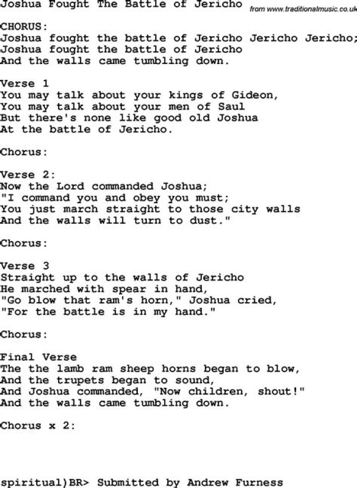 Get lyrics of Joshua fought the battle of jericho ... song you love. List contains Joshua fought the battle of jericho ... song lyrics of older one songs and hot new releases. Get known every word of your favorite song or start your own karaoke party tonight :-).