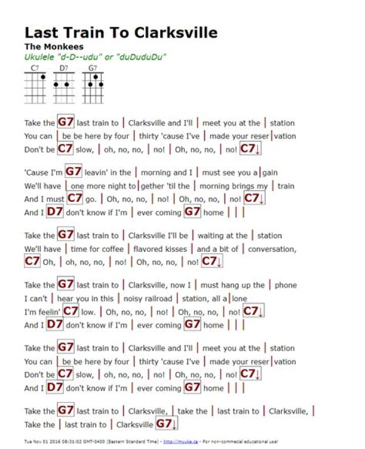 Lyrics for Last Train To Clarksville by Ed Bruce. Take the last train to Clarksville And I'll meet you at the station You can be there by four-thirty 'Cause I've made ...