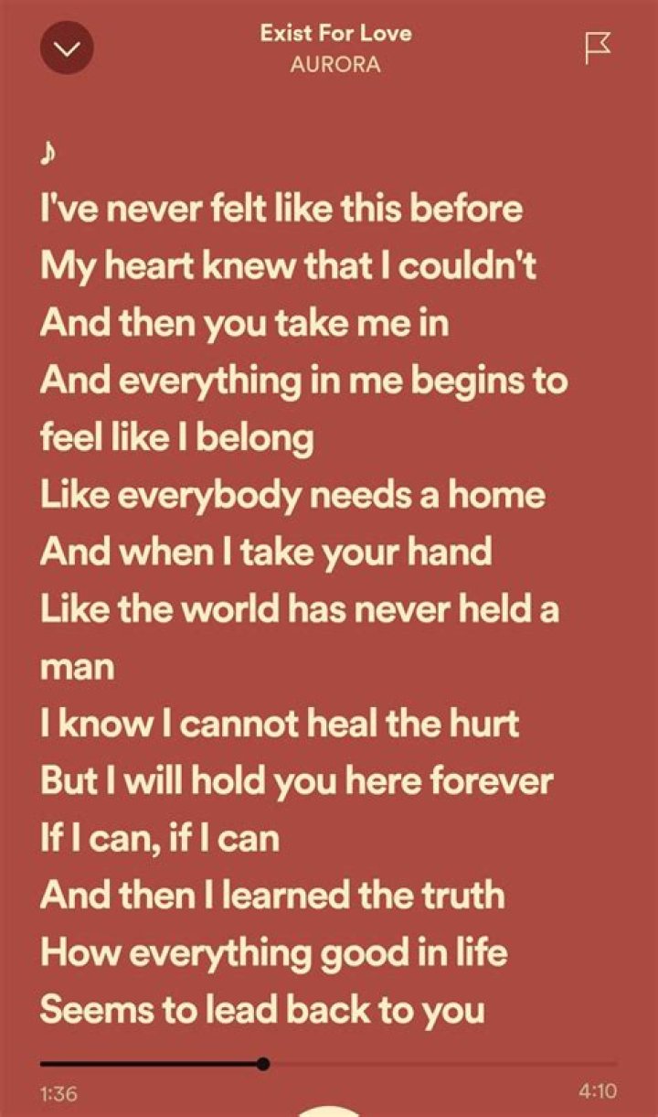 AURORA Lyrics. "Exist For Love". They say there is a war. Between the man and the woman (Ah-ah-ah, ah-ah-ah) I've never felt like this before. My heart knew that I couldn't (Ah-ah-ah, ah-ah-ah) And then you take me in. And everything in me begins to feel like I belong. Like everybody needs a home.AURORA - Forgotten Love Lyrics