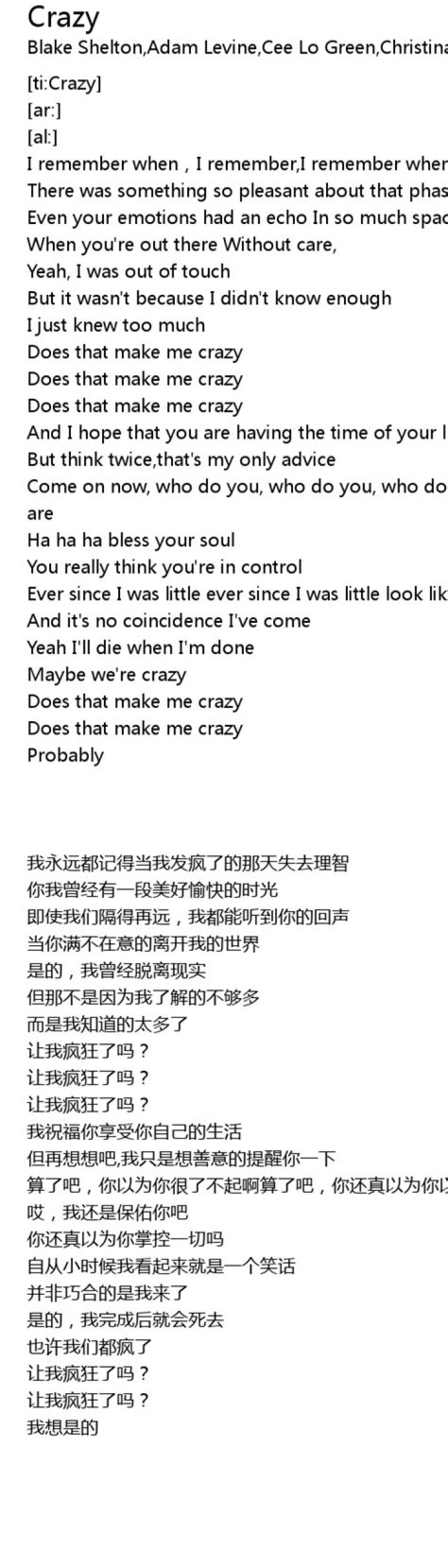 Does that make me crazy? Possibly And I hope that you are having the time of your life But think twice. That's my only advice Come on now. Who do you, who do you, who do you— Who do you think you are? Ha, ha, ha, bless your soul You really think you're in control Well, I think you're crazy, I think you're crazy I think you're crazy. Just like meGNARLS BARKLEY - CRAZY LYRICS
