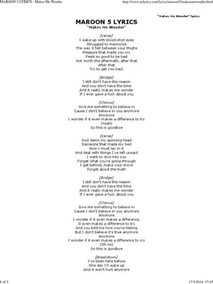 Maroon 5 - Makes Me Wonder Lyrics. I wake up with blood-shot eyes Struggled to memorize The way it felt between your thighs Pleasure that made you cry Feels so good to be bad. Lyrics. Popular Song Lyrics. Billboard Hot 100. Upcoming Lyrics. Recently Added. Top Lyrics of 2011. Top Lyrics of 2010.Ella Mai - Makes Me Wonder Lyrics