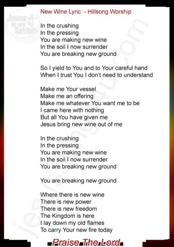 "New Wine" lyrics Hillsong Worship Lyrics "New Wine" Oh In the crushing, in the pressing You are making new wine In the soil I, now surrender You are breaking new ground So I yield to You and to Your careful hand When I trust You, I don't need to understand Make me Your vessel, make me an offering Make me whatever You want me to beHILLSONG WORSHIP - NEW WINE LYRICS