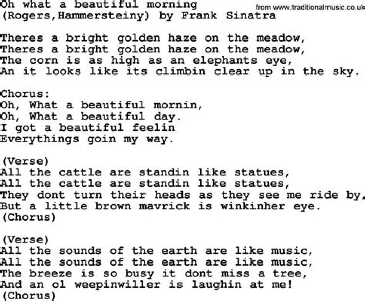 Get lyrics of Oh, what a beautiful morning sun is shining song you love. List contains Oh, what a beautiful morning sun is shining song lyrics of older one songs and hot new releases. Get known every word of your favorite song or start your own karaoke party tonight :-).