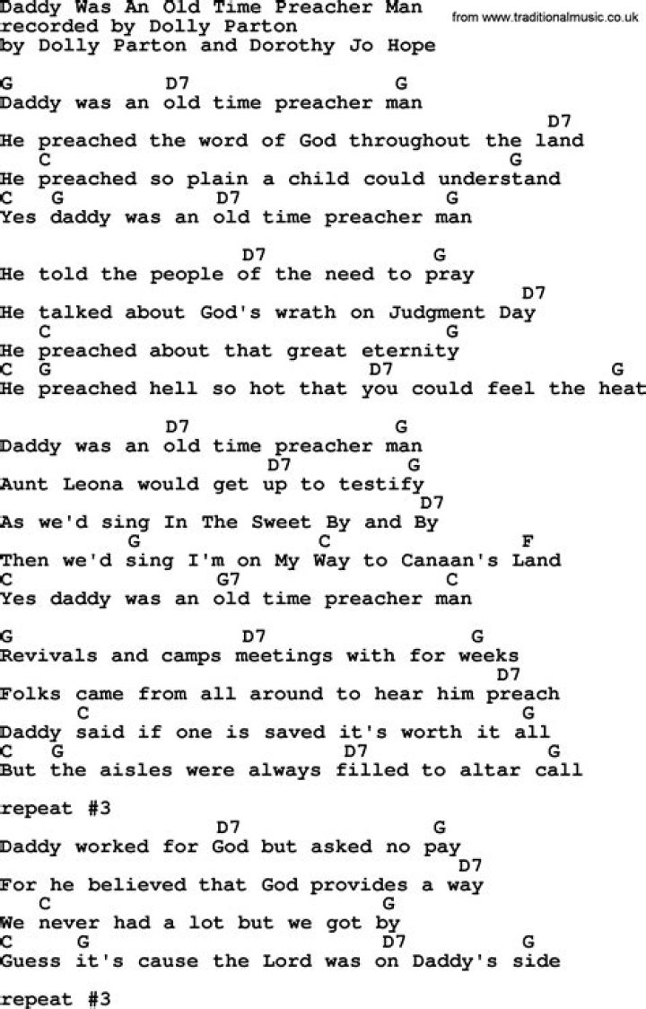 View Dolly Parton song lyrics by popularity along with songs featured in, albums, ... Daddy Was An Old Time Preacher Man Lyrics 2010: Think About Love LyricsKingdom Heirs - Just Preach Jesus Lyrics