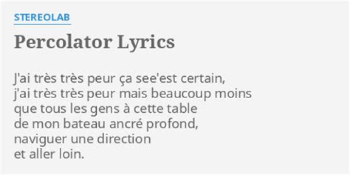 Stereolab - Percolator Lyrics. J'ai très très peur ça c'est certain, J'ai très très peur mais beaucoup moins Que tous les gens à cette table De mon bateau ancré ...Bargain Music - Percolator lyrics