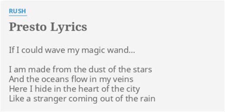 "Presto" lyrics. Rush Lyrics "Presto" If I could wave my magic wand... I am made from the dust of the stars And the oceans flow in my veins Here I hide in the heart of the city Like a stranger coming out of the rain The evening plane rises up from the runway Over constellations of lightRush - Presto Lyrics