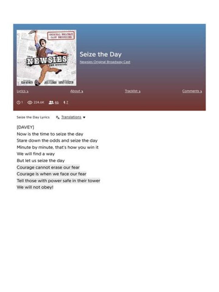 View Newsies song lyrics by popularity along with songs featured in, ... Seize The Day Lyrics 2006: King Of New York Lyrics ... Every Lyric From Kehlani's Debut Album ...NEWSIES ENSEMBLE - SEIZE THE DAY LYRICS