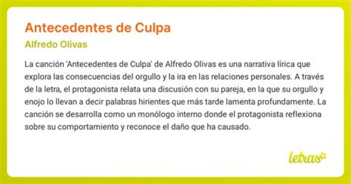 En conclusión, “Antecedentes De Culpa” de Alfredo Olivas es una canción poderosa que nos sumerge en la complejidad de las relaciones tensas y nos invita a reflexionar sobre el arrepentimiento y la importancia de la reconciliación. A través de las letras emocionalmente cargadas y la historia del narrador, la canción nos muestra cómo el orgullo puede ser el causa de la pérdida de una relación significativa. Es una canción que ha dejado una huella en mi corazón y me ha recordado la importancia de dejar de lado el orgullo y buscar la paz y la armonía en nuestras relaciones.