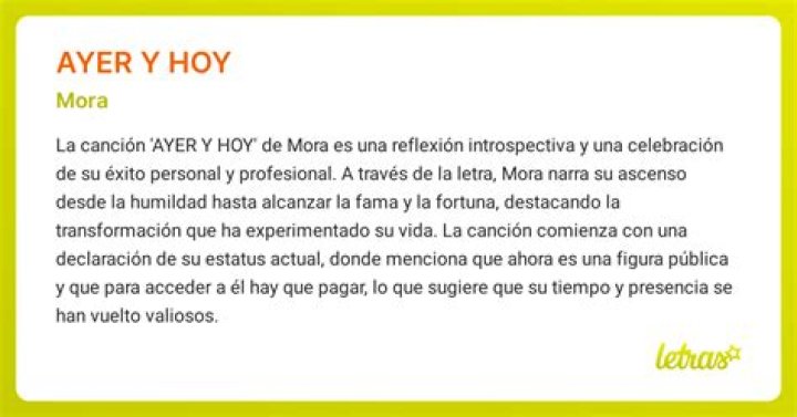 La canción «Ayer y Hoy» de Mora es una melodía que explora temas profundos relacionados con el crecimiento personal, la resiliencia y la autoconfianza. Su letra transmite la experiencia del artista al superar desafíos y la influencia negativa de otros, destacando su capacidad para triunfar sin depender de la validación externa.