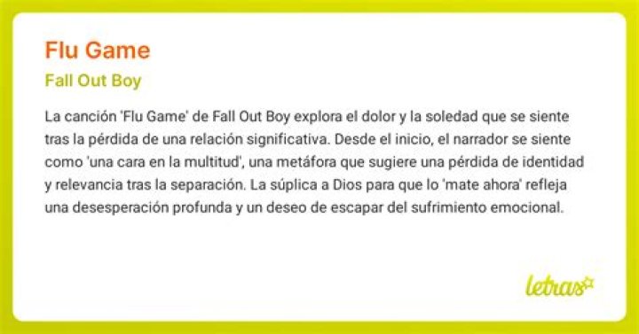 «Flu Game» de Fall Out Boy es una canción que se sumerge en los temas de soledad, autopreservación y la lucha por mantener una fachada. A través de sus letras, la banda pinta un cuadro de alguien que se siente invisible en medio de una multitud, anhelando escapar de su propio dolor y recordando una relación pasada.