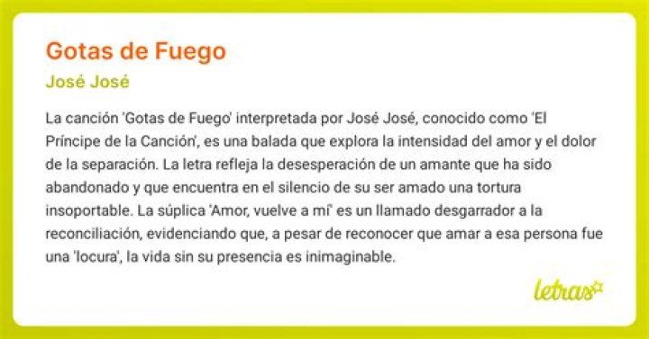 «Gotas de fuego» de José José es una canción que evoca profundos sentimientos de dolor y desesperación causados por una relación que ha llegado a su fin. A través de sus letras apasionadas y emotivas, el cantante expresa su tormento ante el silencio de su amado y su incapacidad para soportar la ausencia de esa persona en su vida.