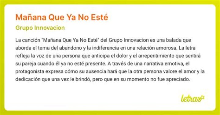 La canción «Mañana que ya no esté» del Grupo Innovación es una poderosa oda al arrepentimiento y a las consecuencias de dar por sentada a alguien en una relación. Sus letras transmiten una profunda sensación de pérdida inminente y la triste realización del valor de una persona solo después de haberla perdido. A través de sus versos, la canción nos invita a reflexionar sobre la importancia de apreciar y valorar a nuestros seres queridos antes de que sea demasiado tarde.