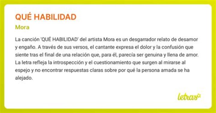 La canción «Qué Habilidad» de Mora es una confesión desgarradora de un hombre que lucha por aceptar el hecho de que su amante lo ha dejado. A través de sus potentes letras, Mora describe un sentimiento profundo de vacío y traición que resuena en aquellos que han experimentado una pérdida amorosa similar. En lo personal, esta canción ha sido una compañera en momentos de desamor, ayudándome a lidiar con el dolor y la confusión que acompañan a una ruptura.